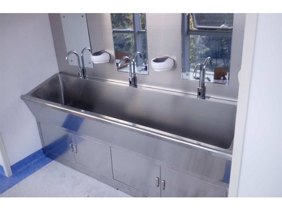 洗手池是手术医务人员洗手专用设备,采用人体感应自动给水,因此无需使用人员触摸,保证清洁,流量500l/h,采用0.1μm超滤膜,可将至毒病菌全部滤掉,同时采用双柱超滤组件,具备反冲技术,可长期使用。 特点: 1.整体采用不锈钢SUS304、1.2mm不锈钢双层制造,中间特殊静音处理。槽身以人体工程学设计,外观美观,且洗手时水花不会溅在身上。 2.鹅颈型水龙头,全自动感应或脚踏、腿部触碰几种给水方式,避免医护人员的手部碰触,有效防止洗手时的交叉感染。 3.配备40-50L热水器和恒温供水装置,水温可根据客户的使用习惯20°—75°自由设定。 4.水池内部采用圆弧角度、无缝焊接、深度打磨、抛光处理。无死角、易于清洁消毒处理,有效防止细菌滋生。 5.配套设备完善,配有自动给药机,照明灯及防雾整装镜辅助设备。 6.多种型号、多个系列产品可供客户选择,也可根据客户的使用要求生产加工。