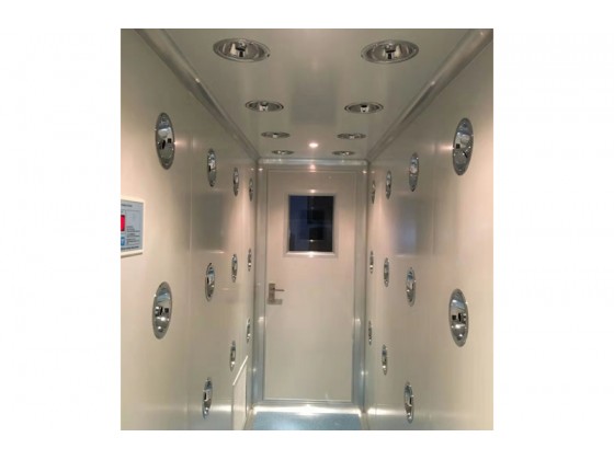 风淋室可以清除人身和物品表面附着的尘埃,减少带入洁净空气的灰尘量,同时起到兼有气闸室功能,可防止不洁净空气由门侵入,以配合洁净空调系统确保洁净室达到所需洁净度。